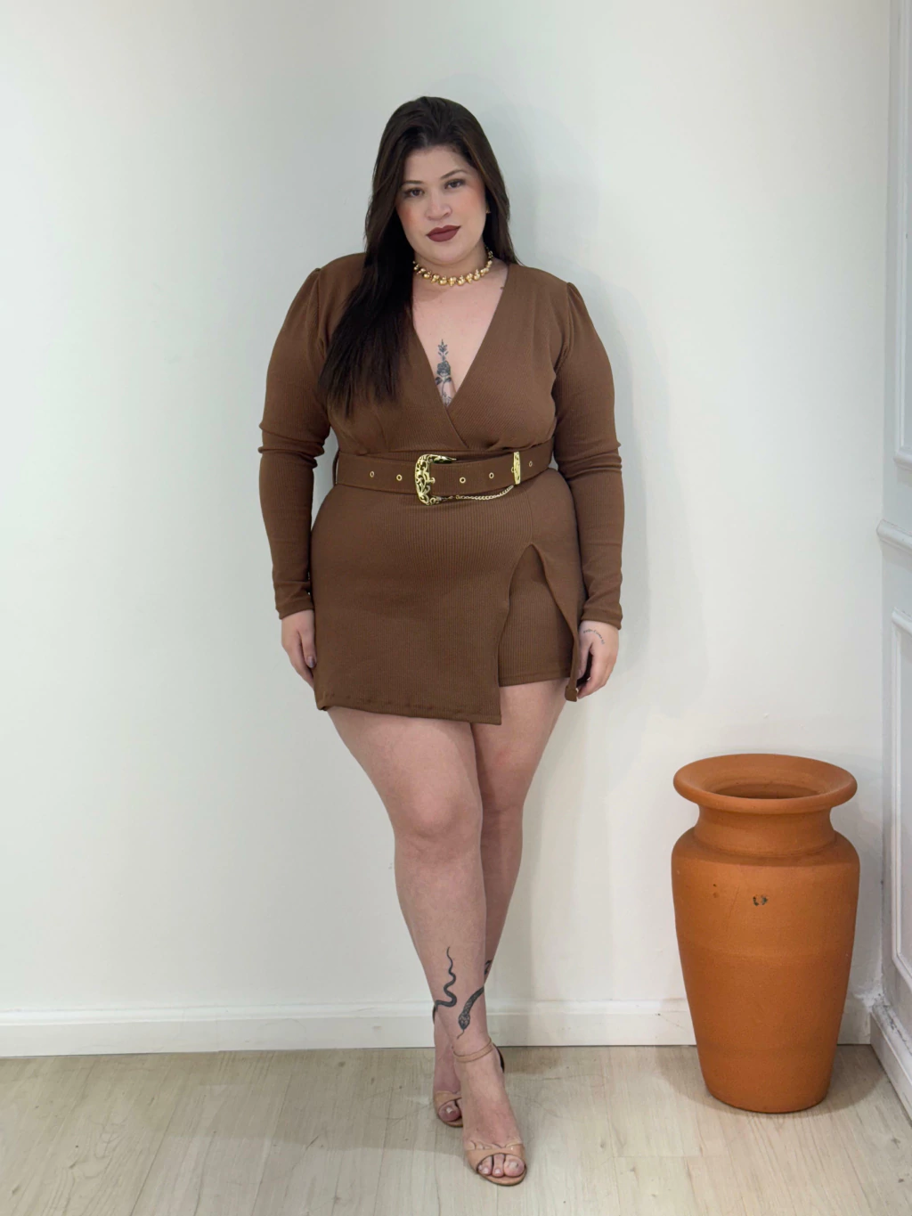 Macaquinho Feminino Manga Longa Anarruga Com Cinto Plus Size