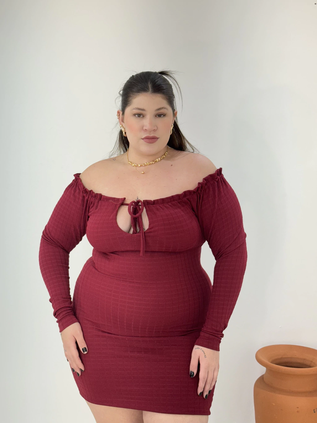 Descrição do Produto: Vestido ombro a ombor, tecido Anarruga, possui bojo, elastico no ombro, detalhe em amarração.
